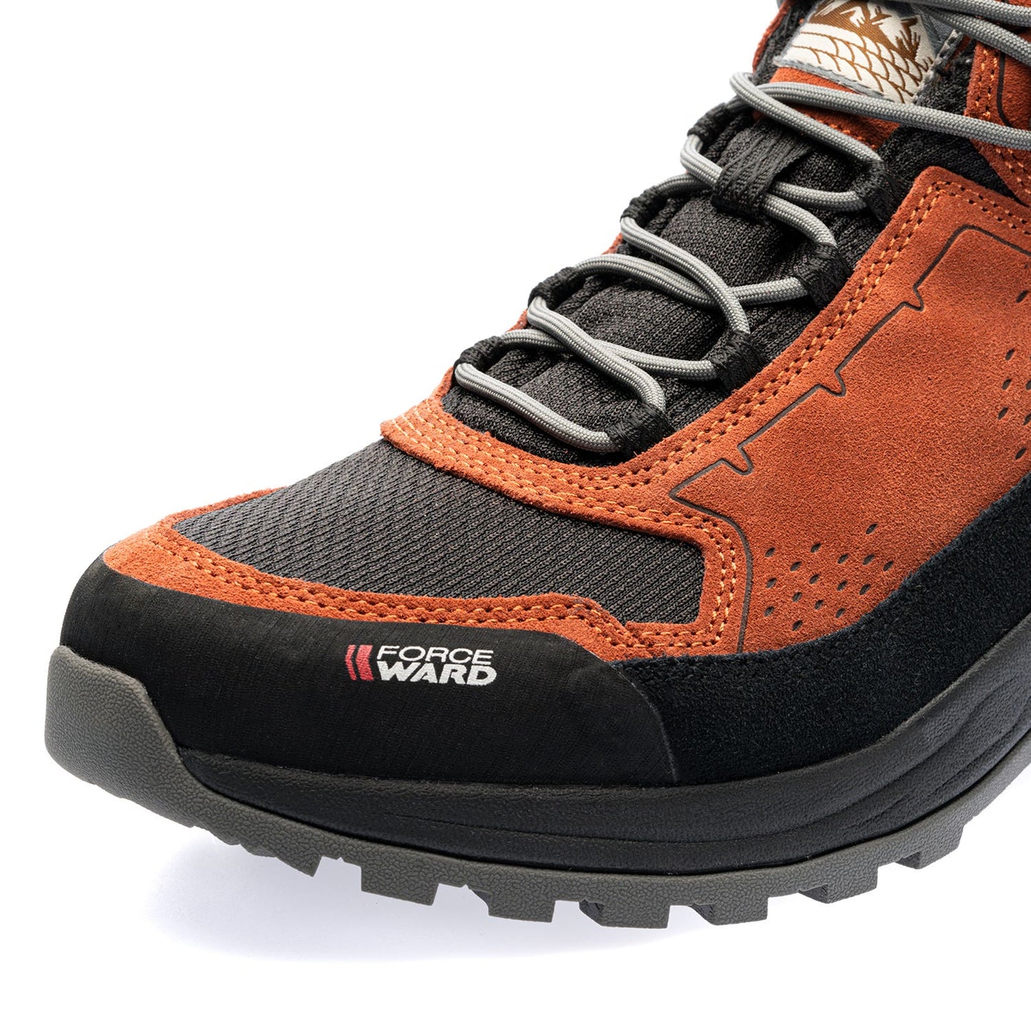 Botin Hiking Capellada de cuero resistente ante goles y cortes. Caña media; Estabilidad y seguridad Refuerzo de goma en puntera; Force Ward. Membrana con tecnología B-dry imperbeable y respirable. Cordones de ajuste rapido y seguro