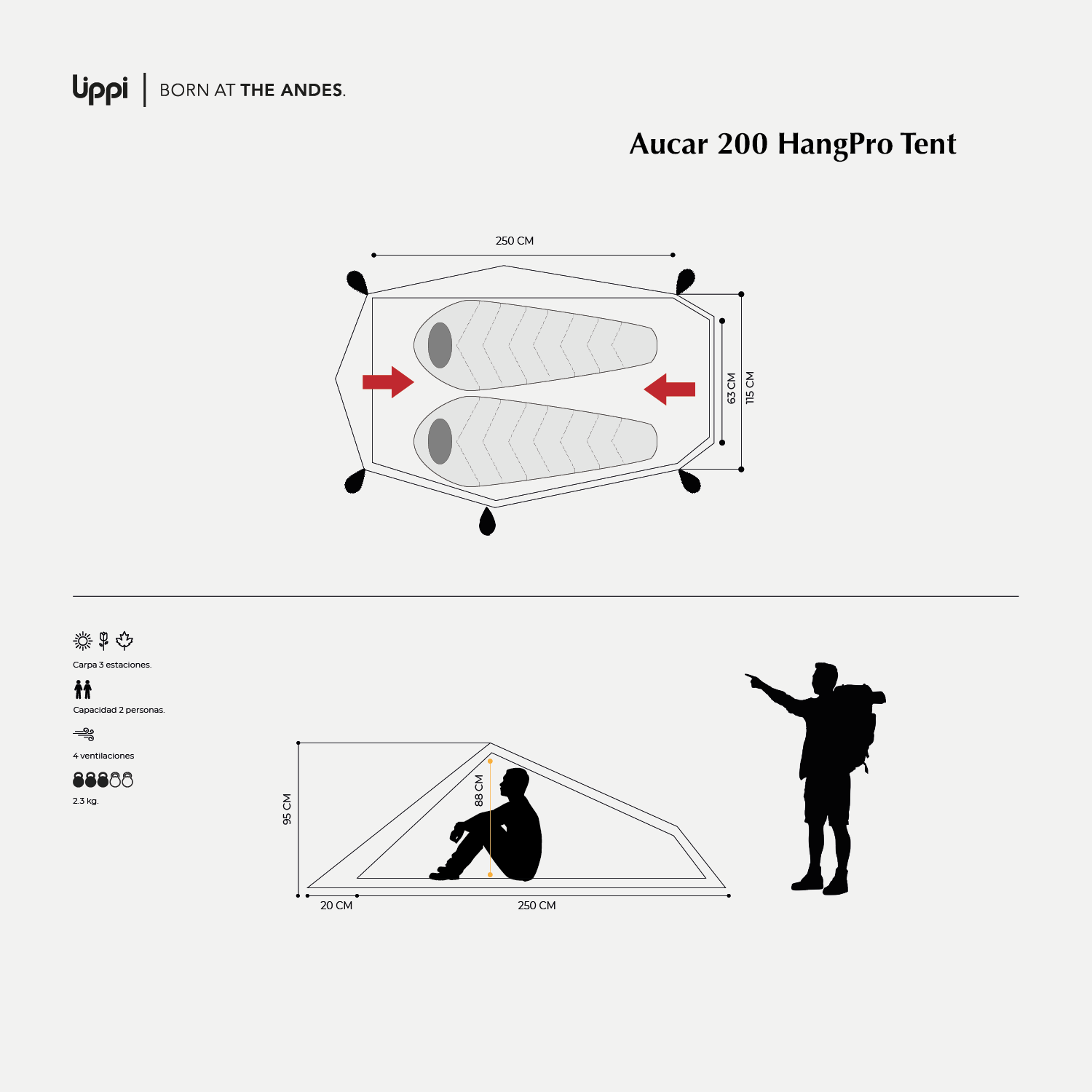Carpa 3 estaciones. Capacidad para 2 personas. Una entrada. Cuatro ventilaciones. Un vestíbulo para guardar el equipo. ESTRUCTURA 2 set de varillas preformadas de duraluminio (D 7.9mm) de alta resistencia y bajo peso. 18 Estacas de aluminio ultra livianas. DIMENSIONES Alto: 88 cm (interior); 95 cm (exterior). Ancho: 90 cm (interior); 174 cm (exterior). Largo: 250 cm (interior); 270 cm (exterior). En su empaque: 50 x 16 cm. PESO TOTAL 2.3 Kg. COMPLEMENTOS Vientos reflectantes y ajustables, para una máxima resistencia. 2 áreas cubiertas fuera de la carpa interior, para guardado de equipo. Tiradores fotoluminiscentes para fácil acceso en la oscuridad. Bolsillos interiores.