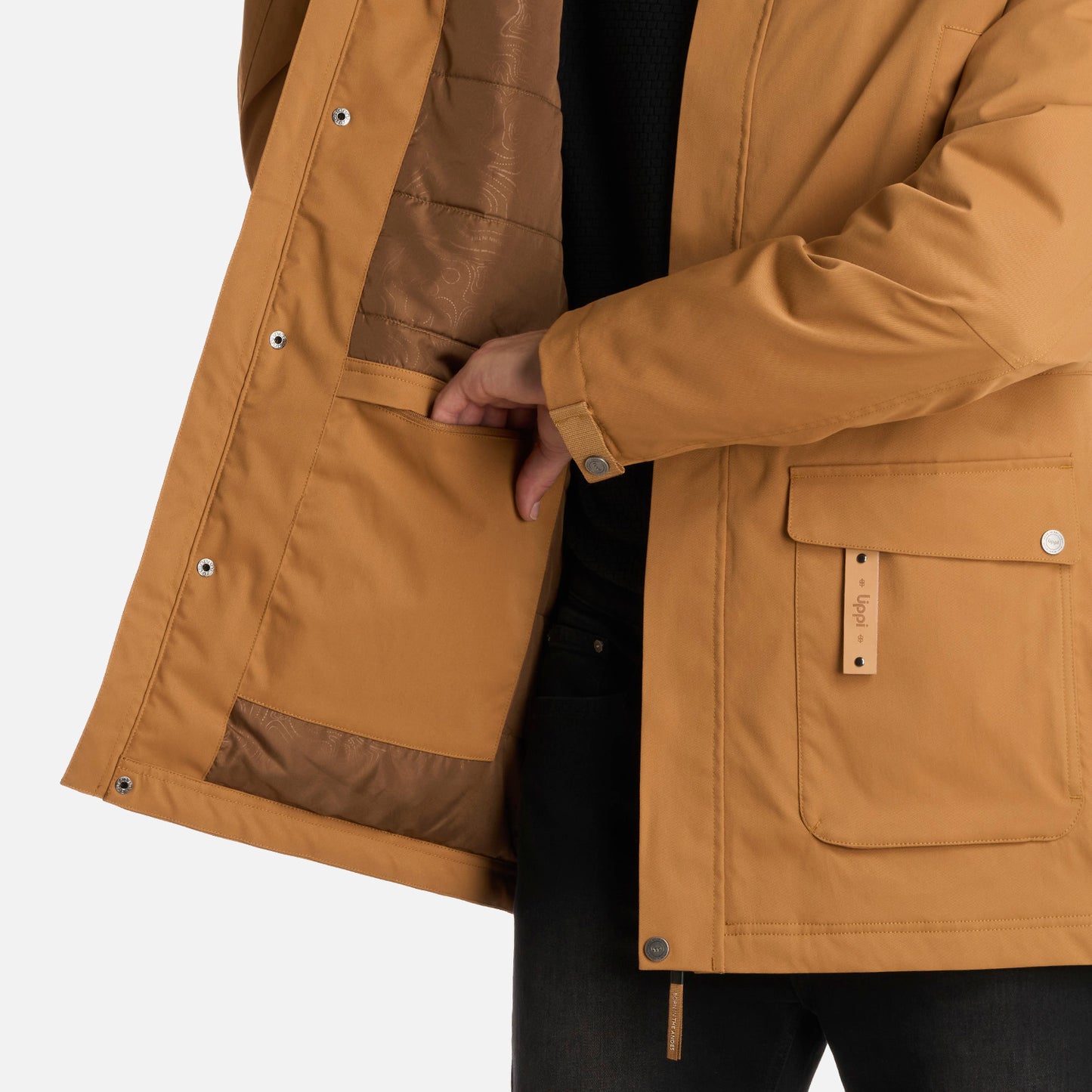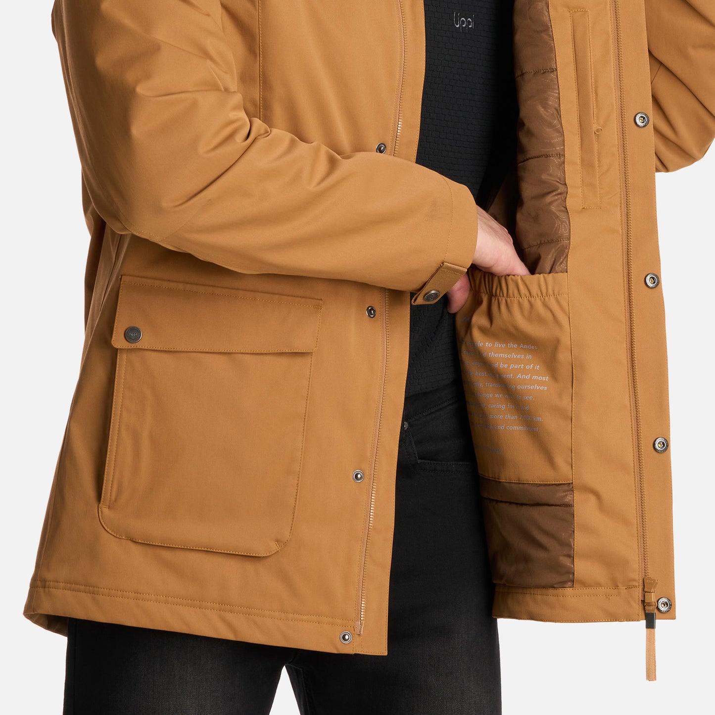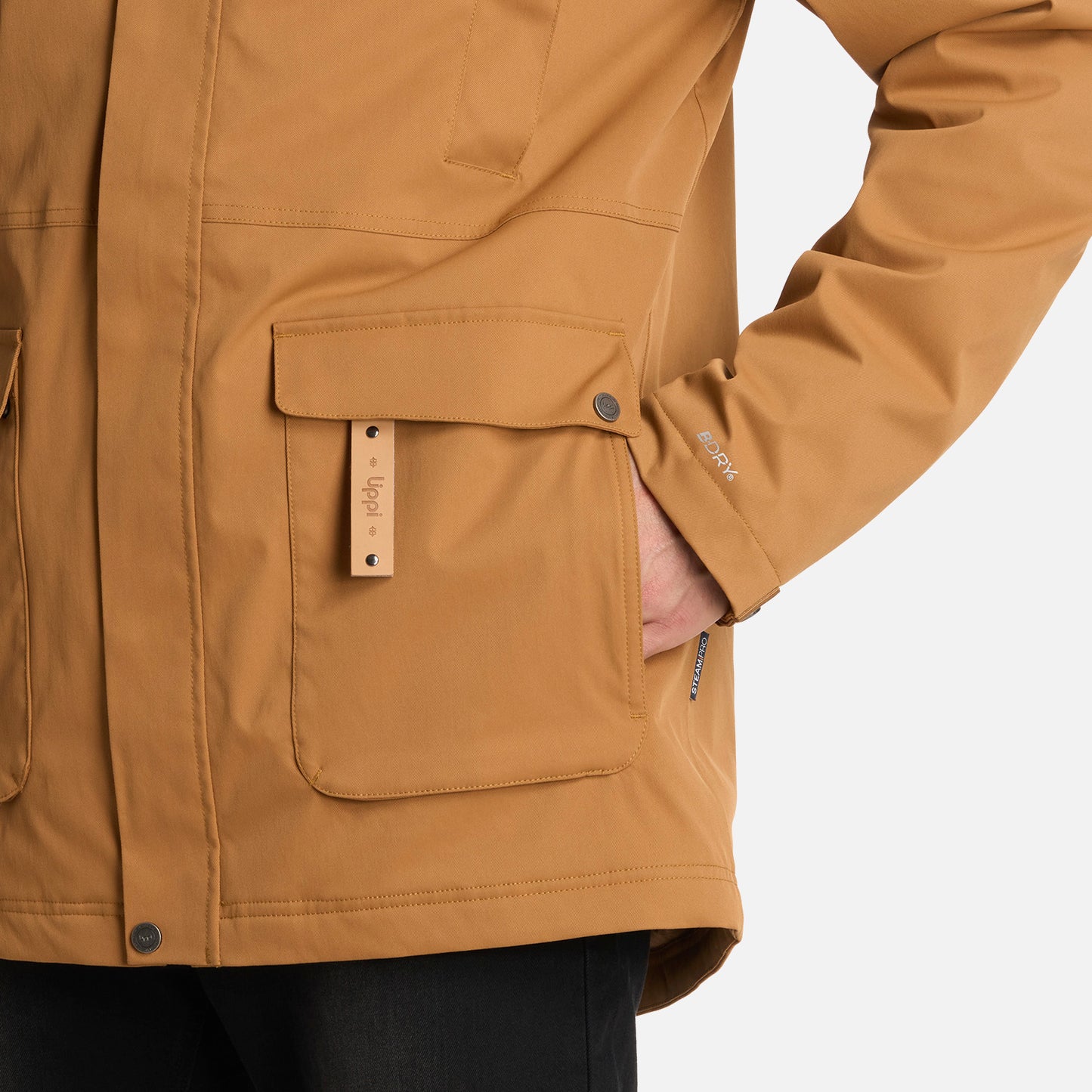 Chaqueta impermeable tecnología B-dry ® Costuras termoselladas Membrana 10.000/10.000 Cierre principal YKK y tapeta con broches Bolsillos en pecho con broches Bolsillos de mano de parche con tapeta y broches metálicos Interior insulado con relleno sintético 100% reciclado Bolsillos internos Gorro con ajuste de tankas Llavero decorativo Ajuste de puños con broches