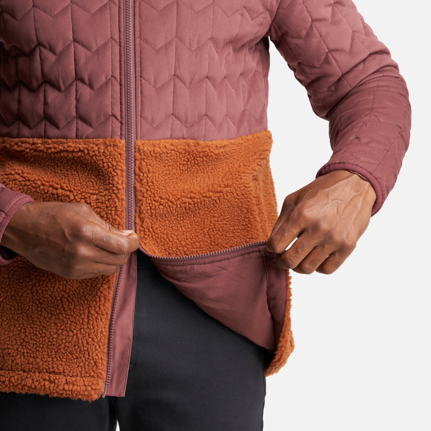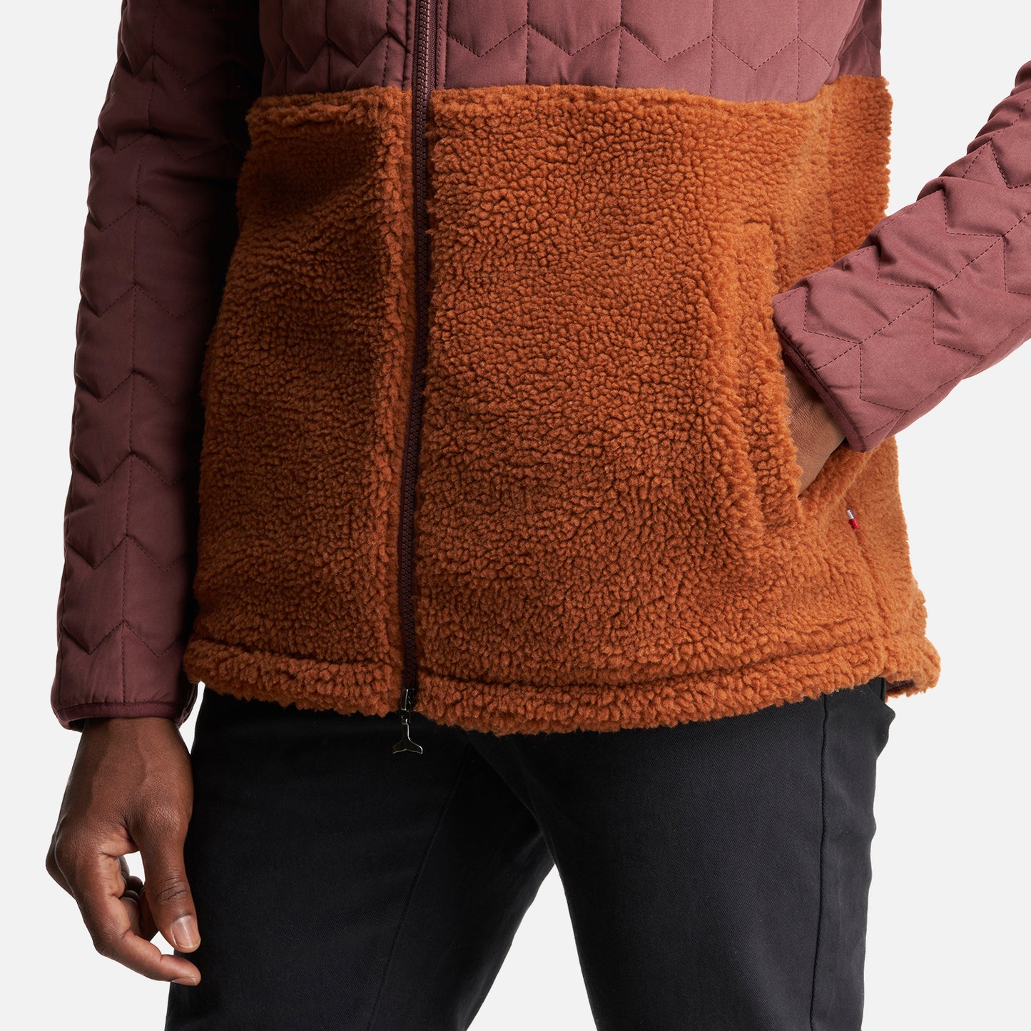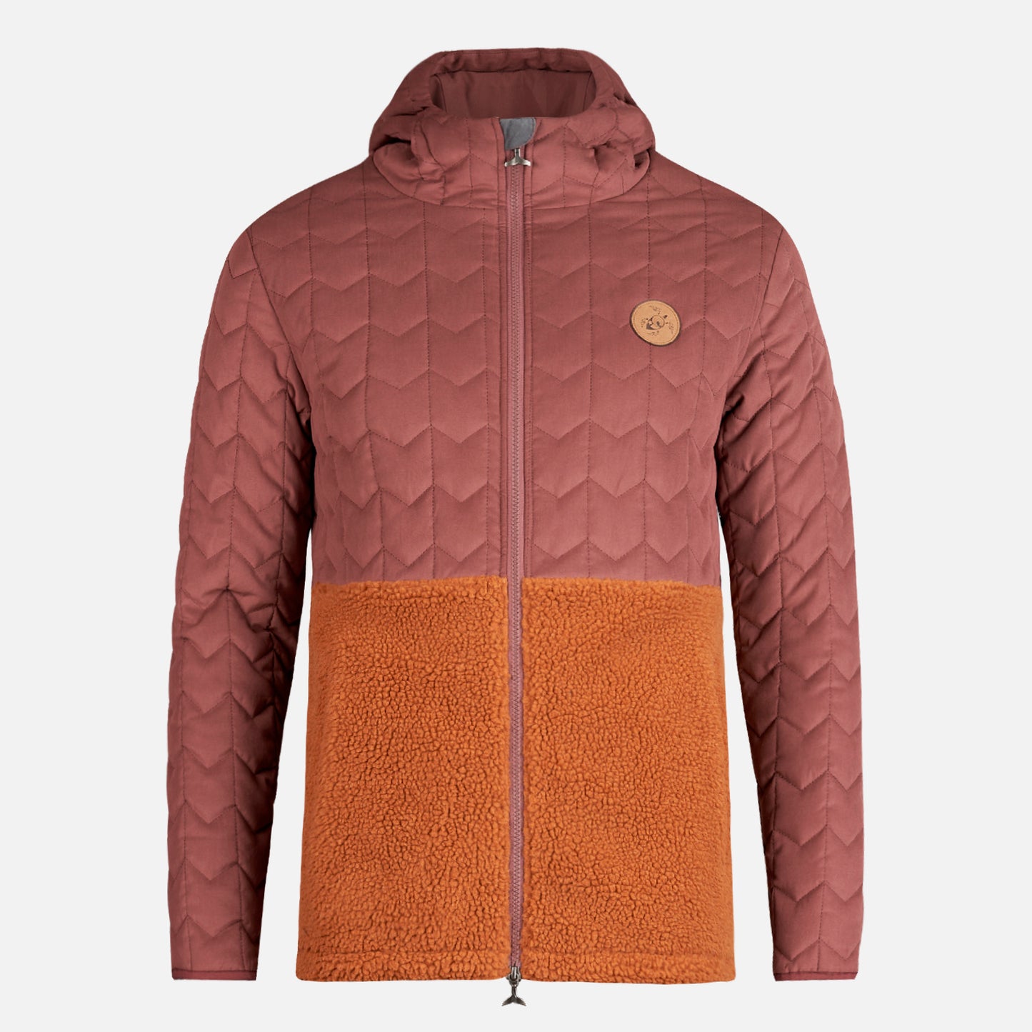 Chaqueta híbrida con gorro; Parte superior insulada e inferior de sherpa Cierre completo marca YKK Bolsillos laterales sin cierre