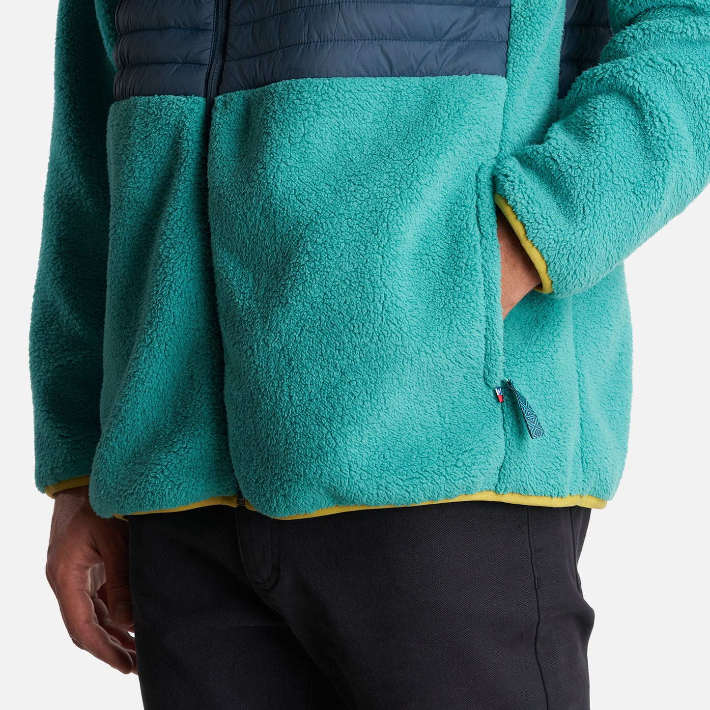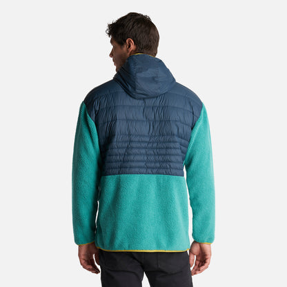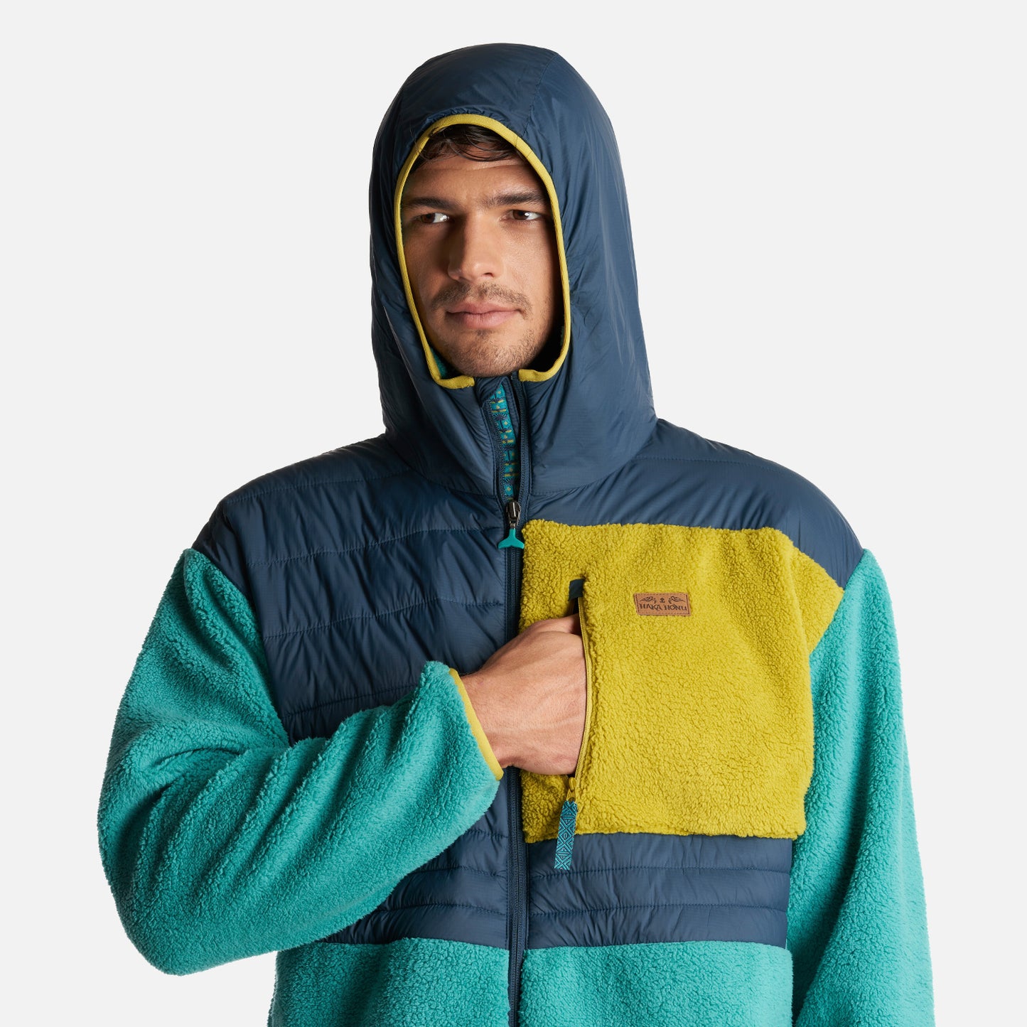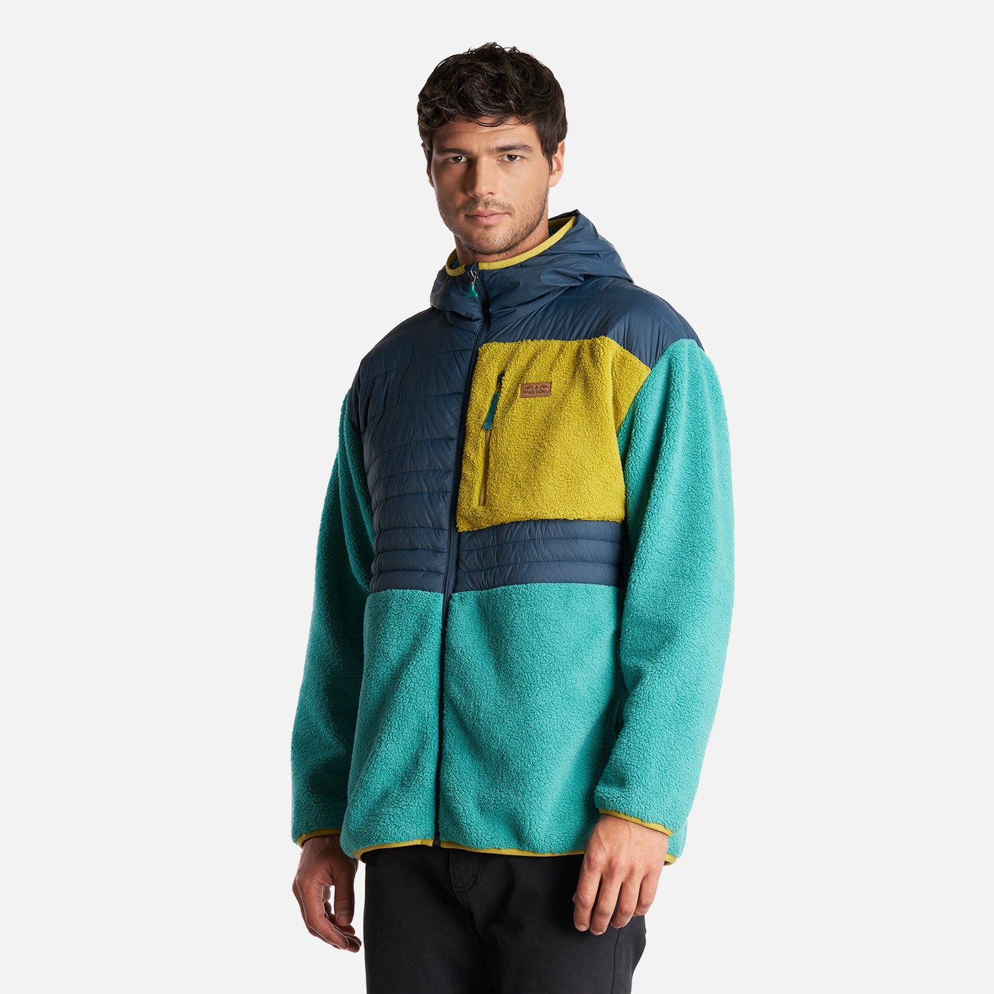 .- Chaqueta híbrida - Pecho, espalda y gorro con tela shaggy pelo corto, pecho y espalda insulado - Relleno sintético SteamPro, 100% polyester reciclado. - Cierre principal YKK - Bolsillos laterales y en pecho con cierre YKK - Banda elastica en gorro, puños y basta - Fit: regular