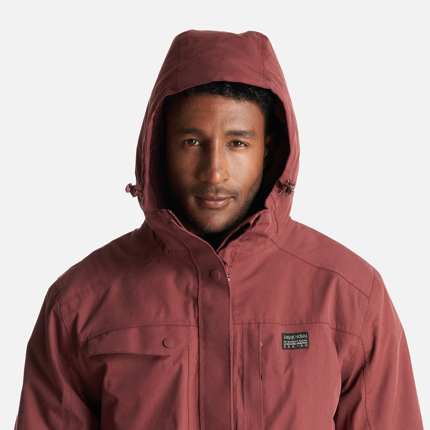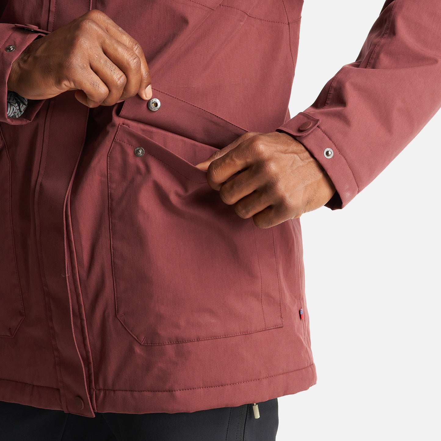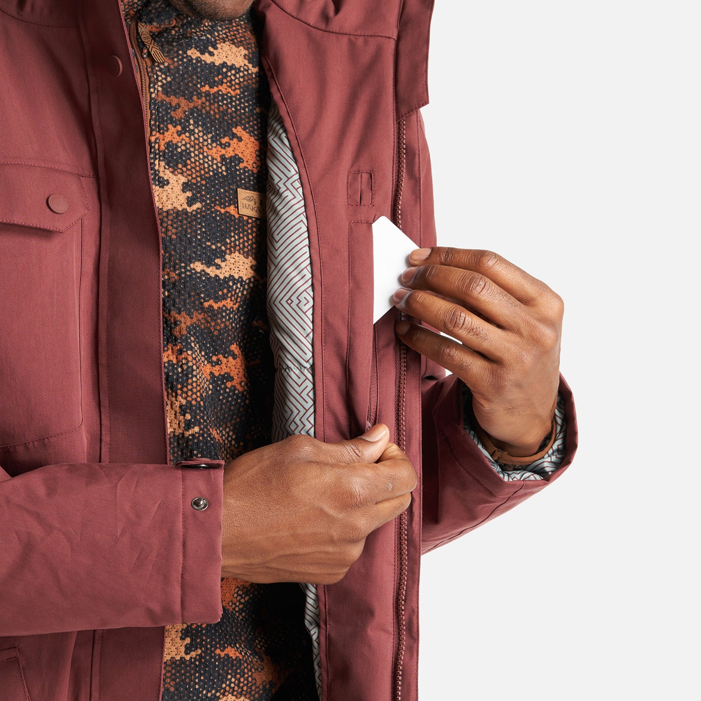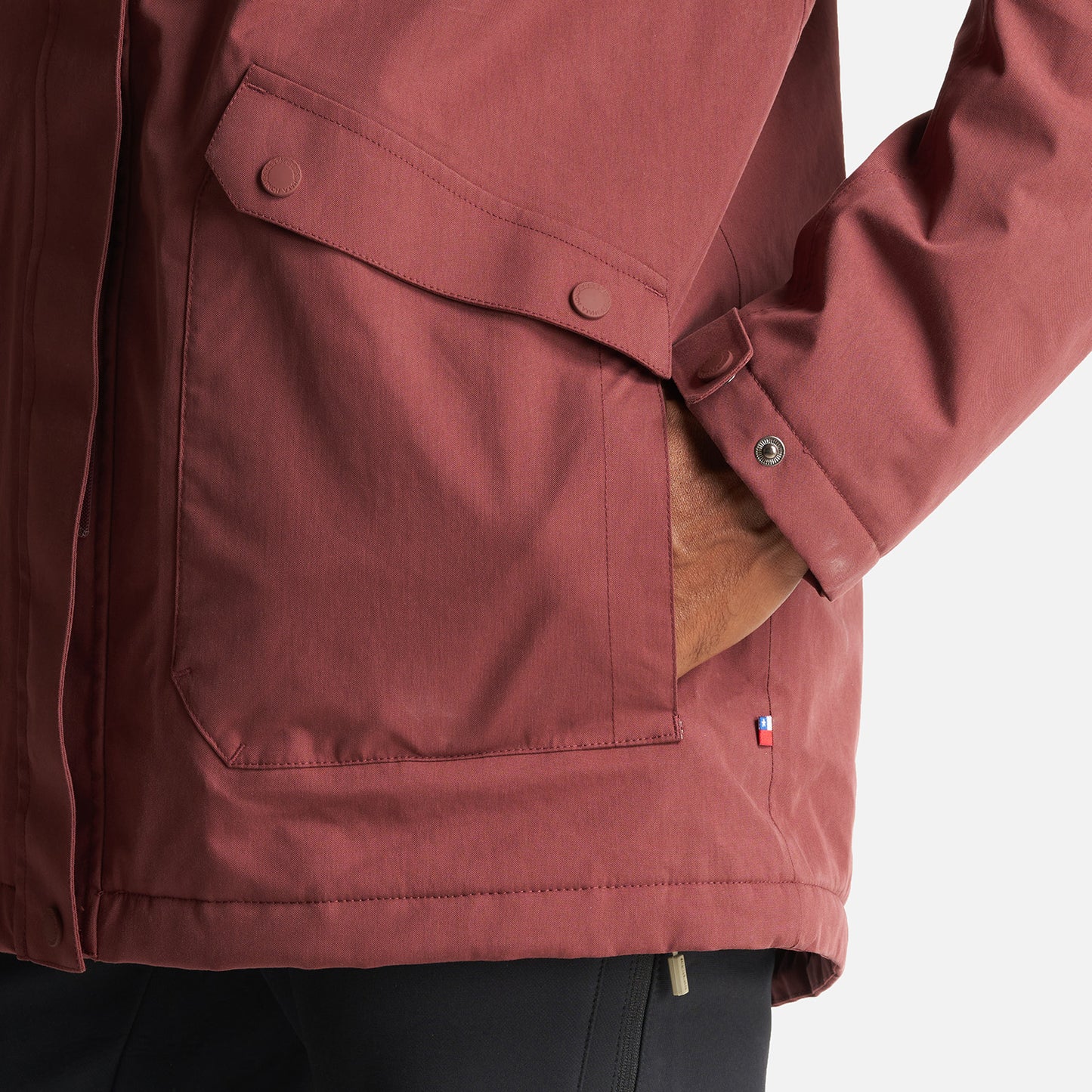 Chaqueta técnica impermeable con gorro. Todas las costuras están termoselladas internamente. Membrana 10.000/10.000 Cierre principal YKK con tapeta; 2 snaps visibles y velcro. 2 bolsillos de pecho; 1 con tapeta y 1 con cierre YKK 2 bolsillos de mano dobles; con tapeta e ingrso superior y por el costado Ajuste de mangas con velcro. Gorro con doble sistema de ajuste; frontal con elástico y reguladores plásticos y ajuste posterior con cinta y regulador DURAFLEX. Interior de tela shaggy. Forro estampado Bolsillo interopr con cierre y abertura para audífonos