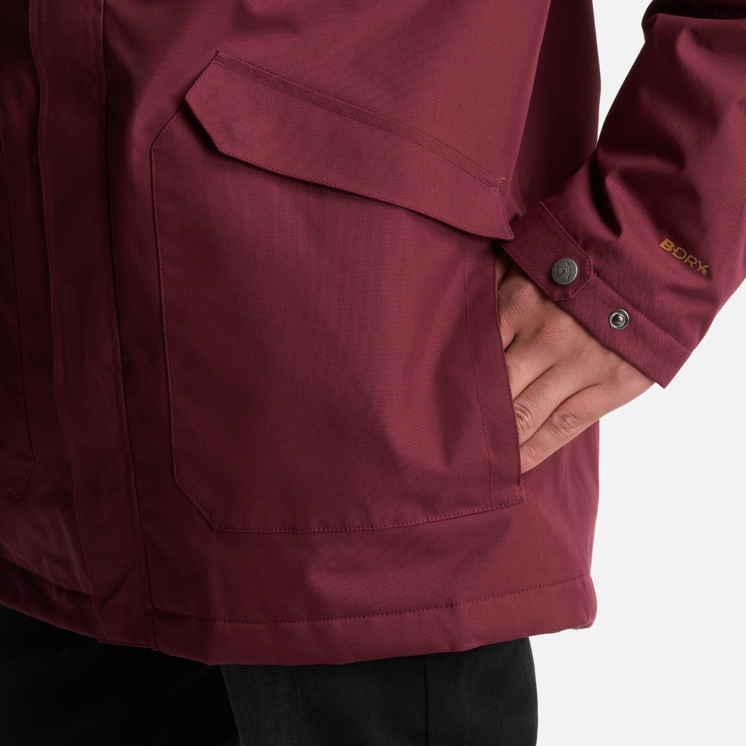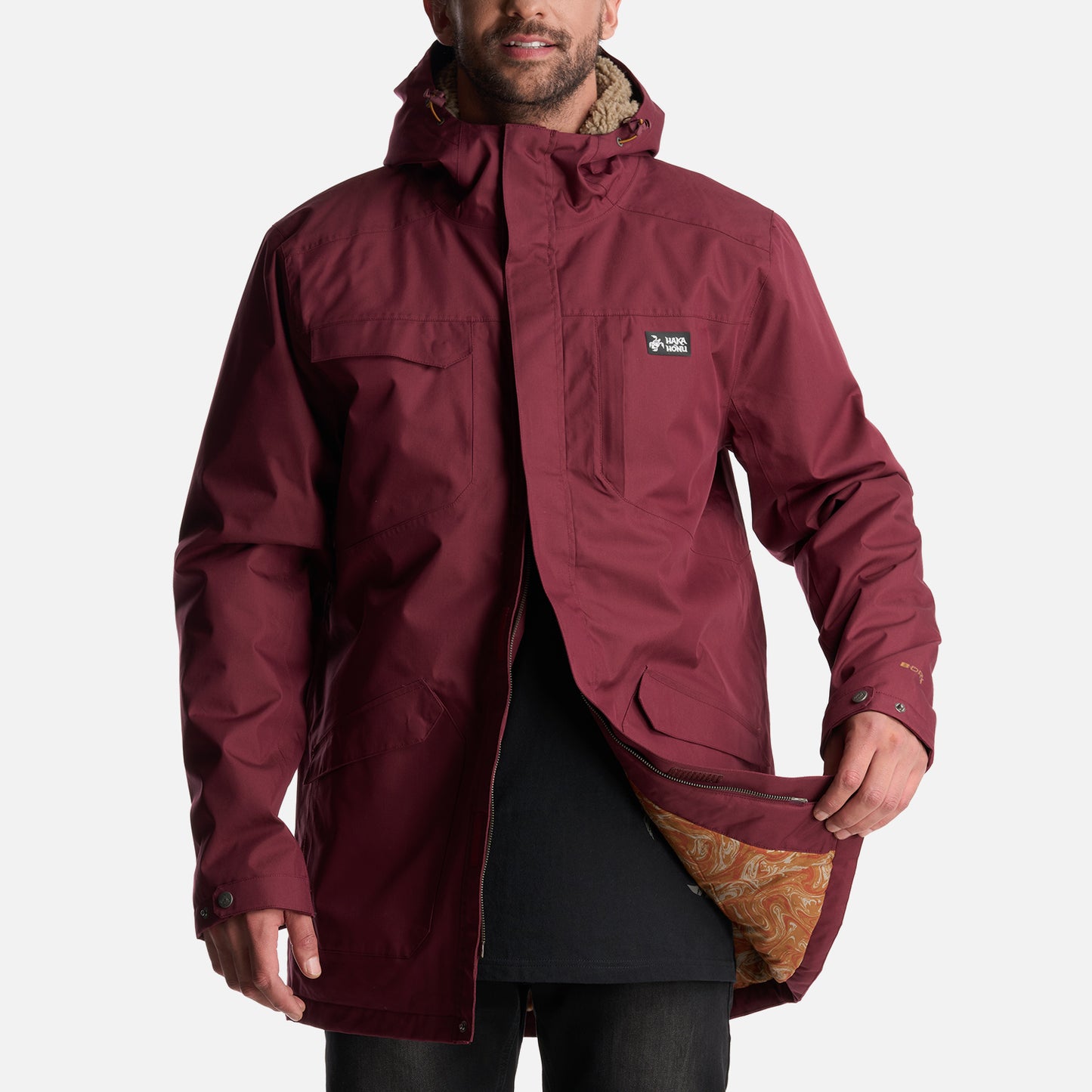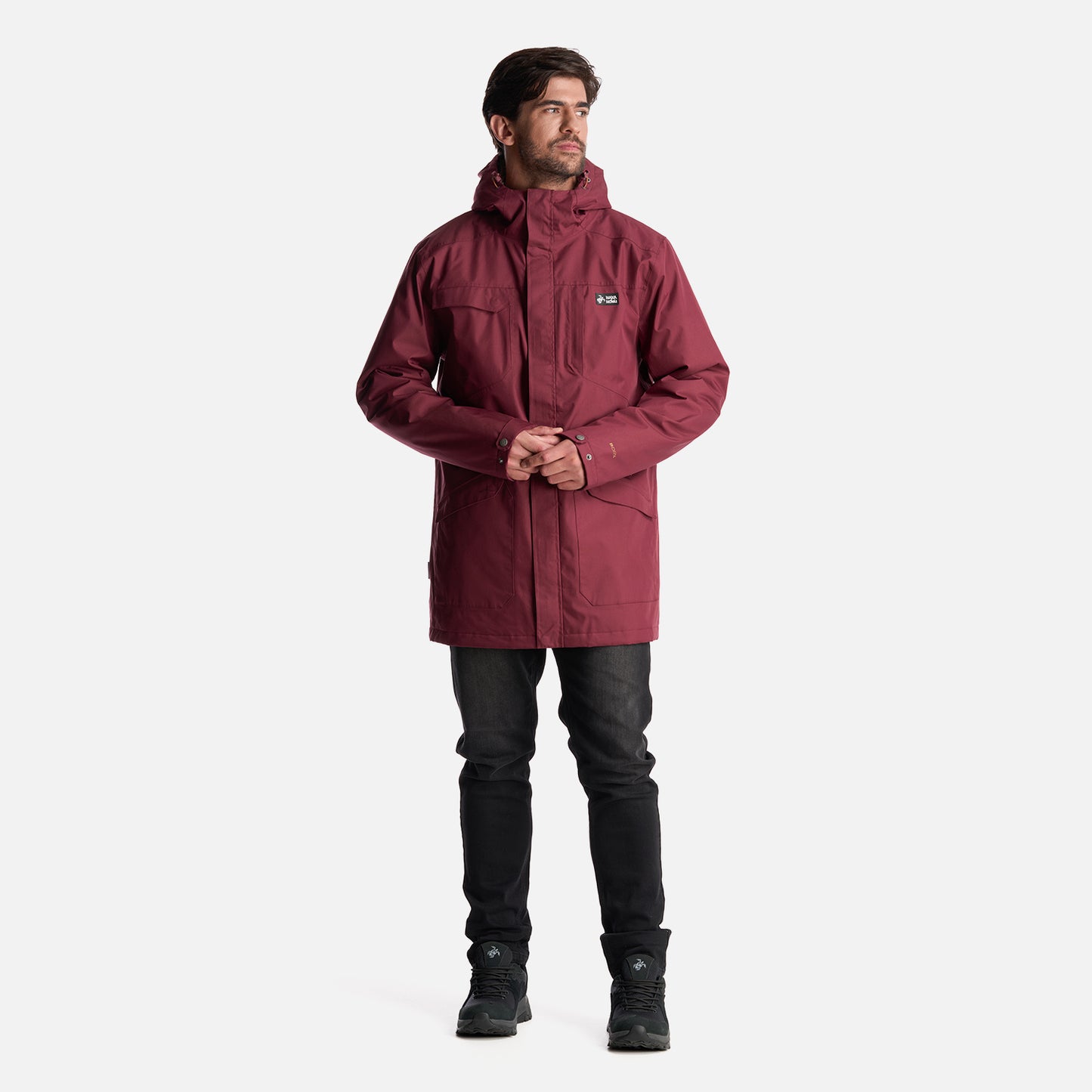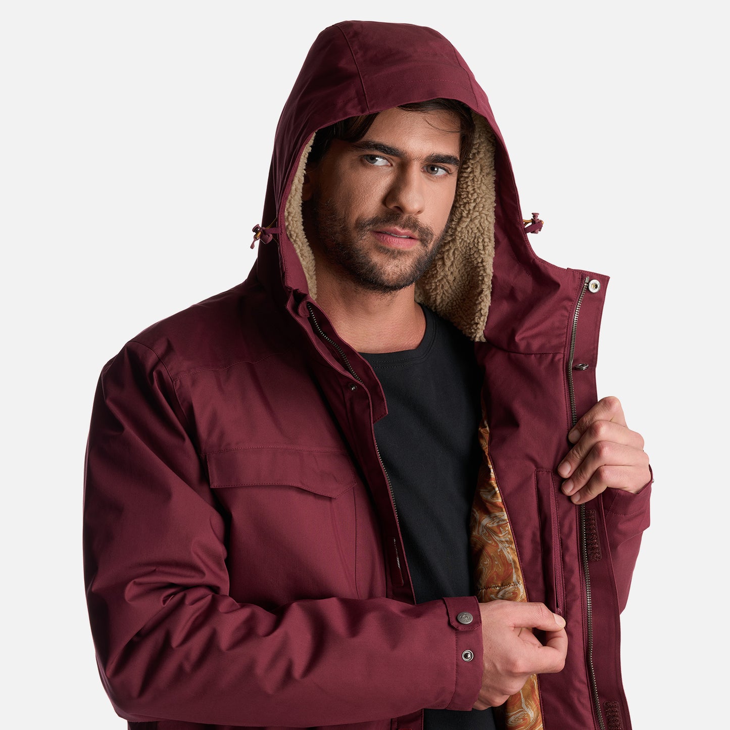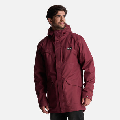 - Chaqueta impermeable 2 capas. - Tratamiento repelencia. - Membrana 10.000 / 10.000. - Relleno SteamPro 100% Poliéster reciclado. - Cierre principal YKK. - Bolsillo de pecho con tapeta. - Gorro con ajuste trasero, Gorro con visera plegable. - Ajuste en cintura con tankas. - Ajuste en puños con tapeta y broches. - Gráficas: Accesorios de cuero. - Bolsillo interior con cierre YKK. - Tela interior: Forro estampado, Tela Shaggy en espalda para mayor abrigo. - Tapeta con broches a la vista. - Bolsillos parche. - Calce regular.