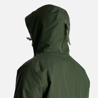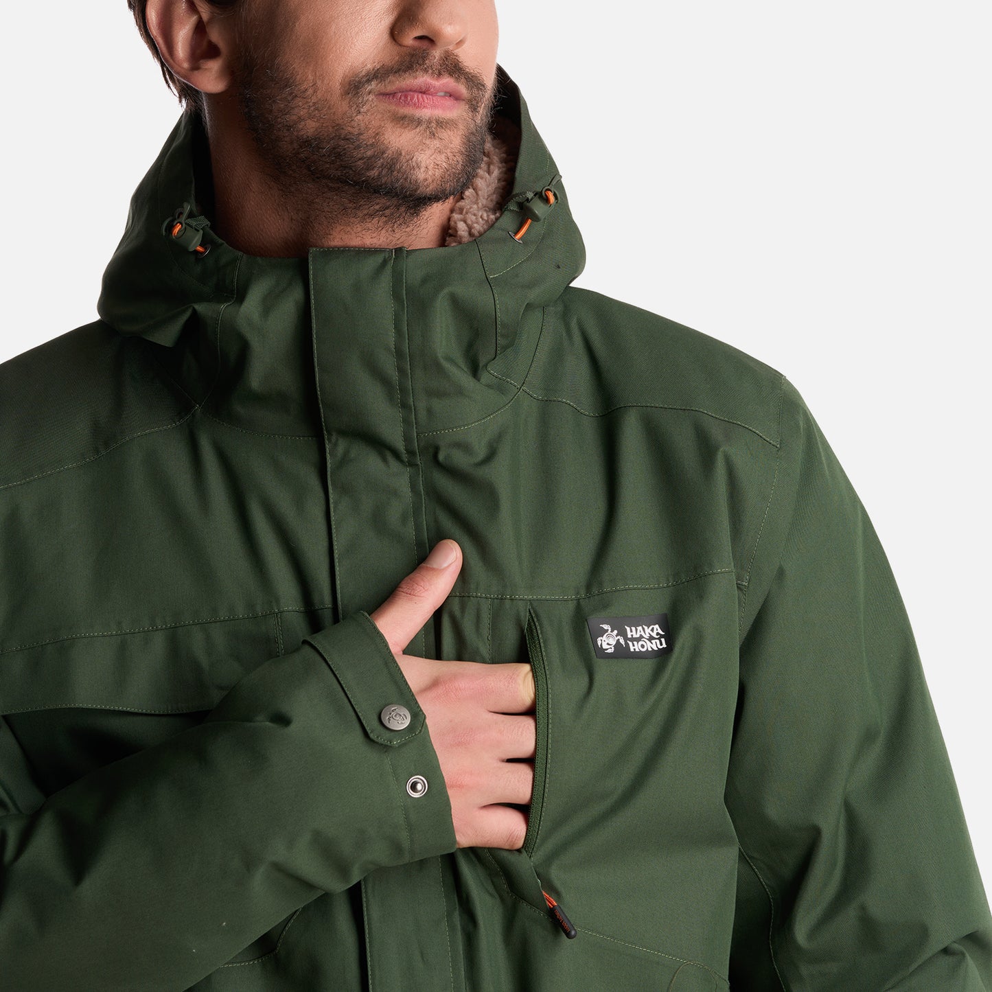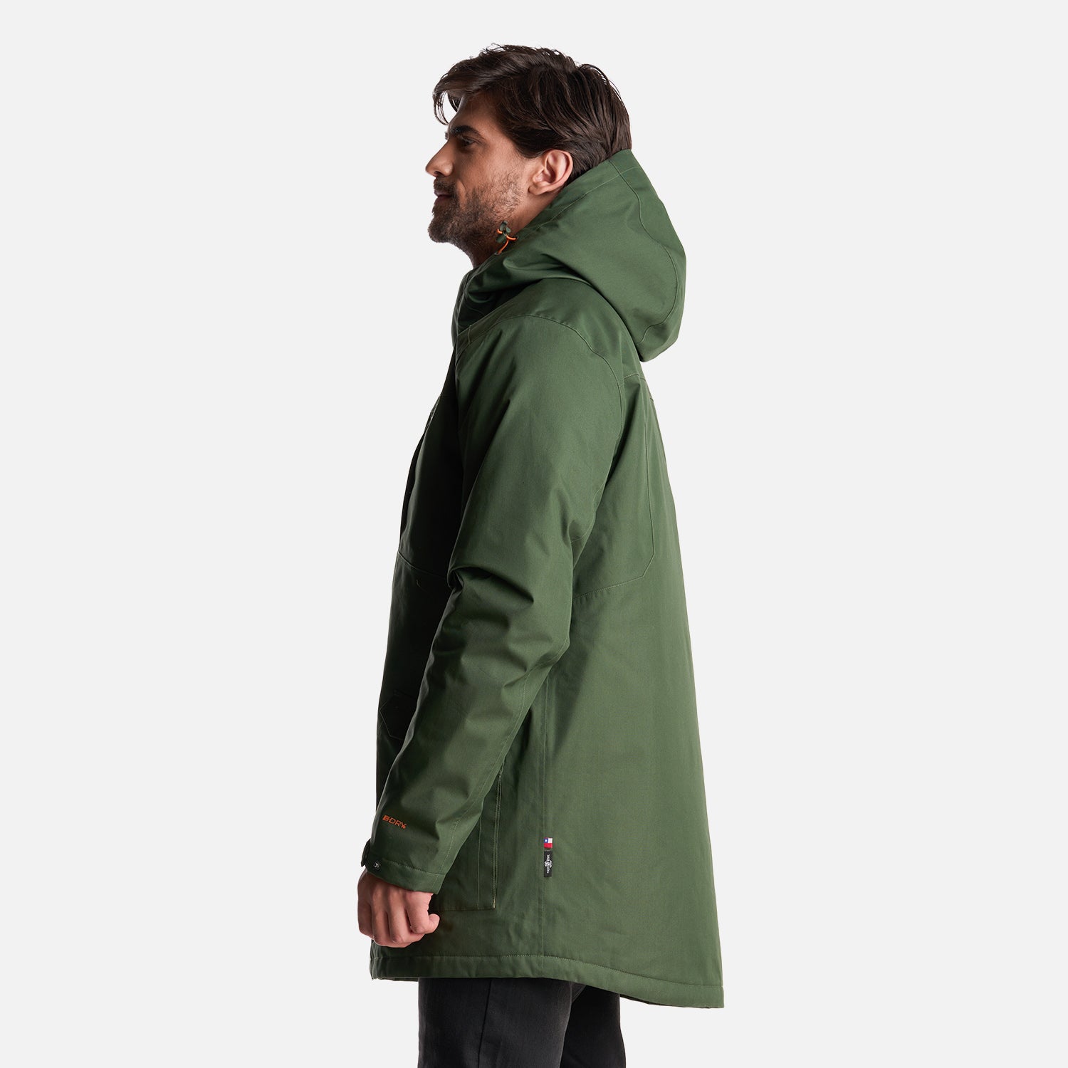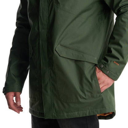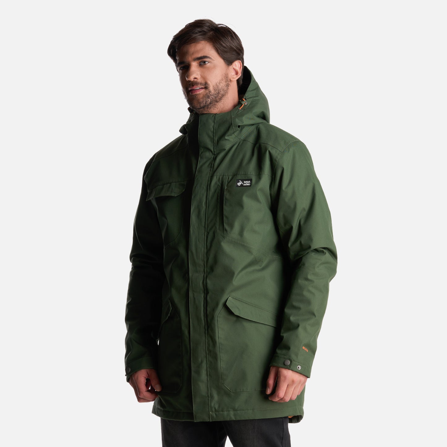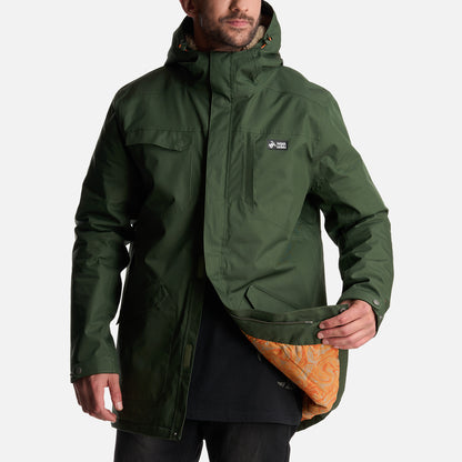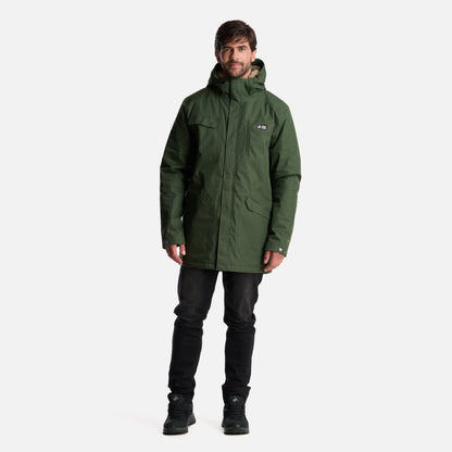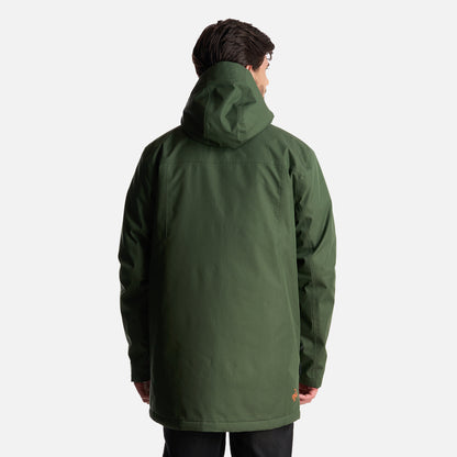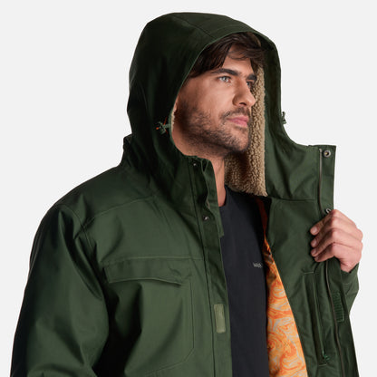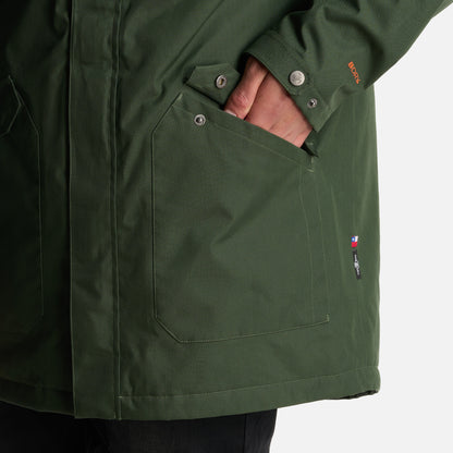 - Chaqueta impermeable 2 capas. - Tratamiento repelencia. - Membrana 10.000 / 10.000. - Relleno SteamPro 100% Poliéster reciclado. - Cierre principal YKK. - Bolsillo de pecho con tapeta. - Gorro con ajuste trasero, Gorro con visera plegable. - Ajuste en cintura con tankas. - Ajuste en puños con tapeta y broches. - Gráficas: Accesorios de cuero. - Bolsillo interior con cierre YKK. - Tela interior: Forro estampado, Tela Shaggy en espalda para mayor abrigo. - Tapeta con broches a la vista. - Bolsillos parche. - Calce regular.
