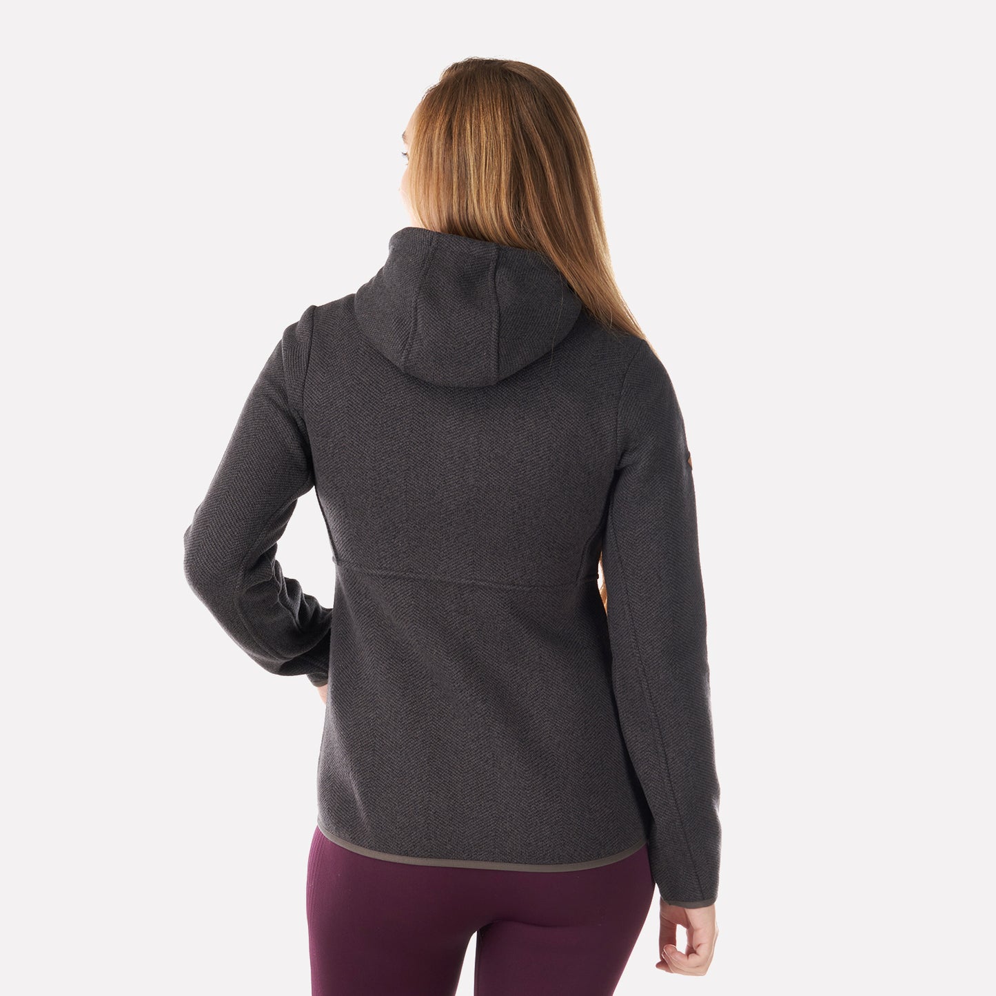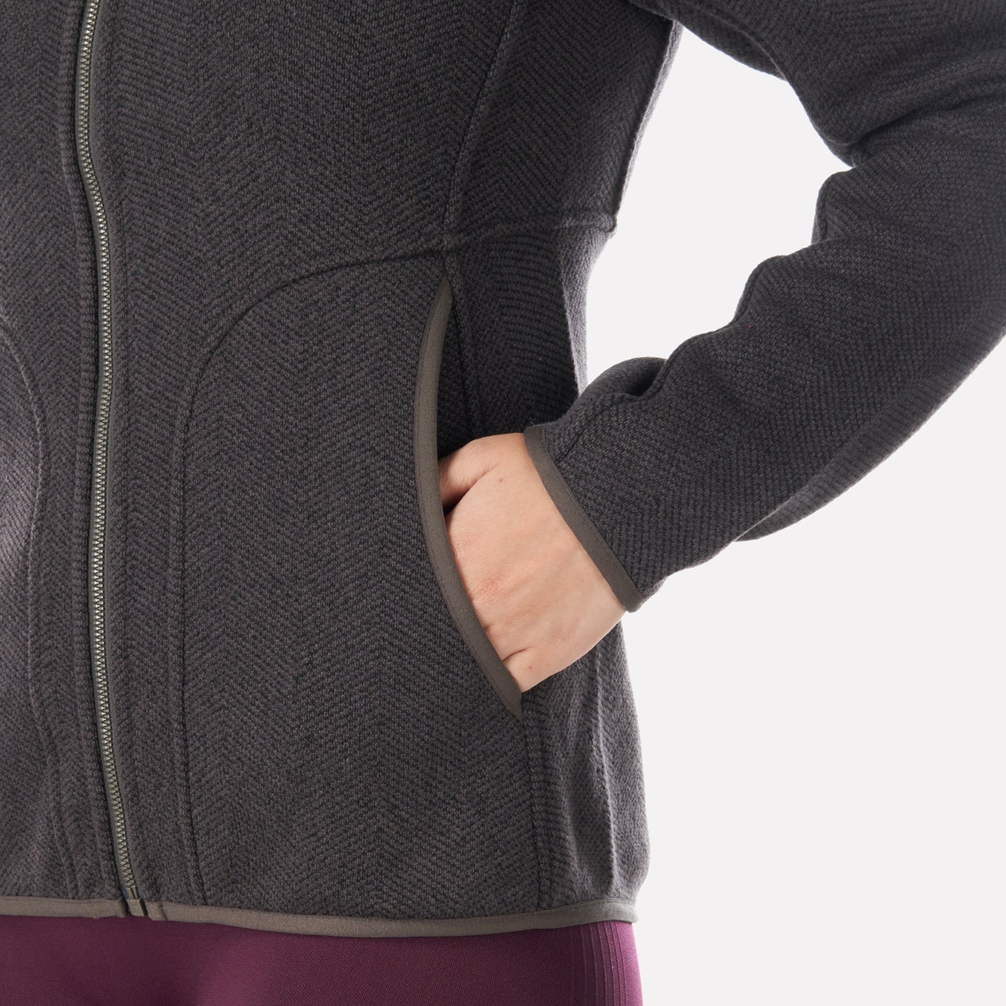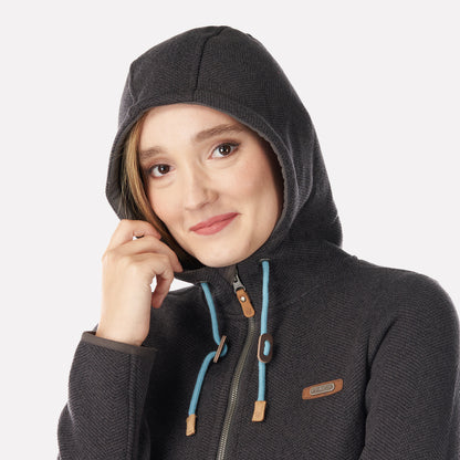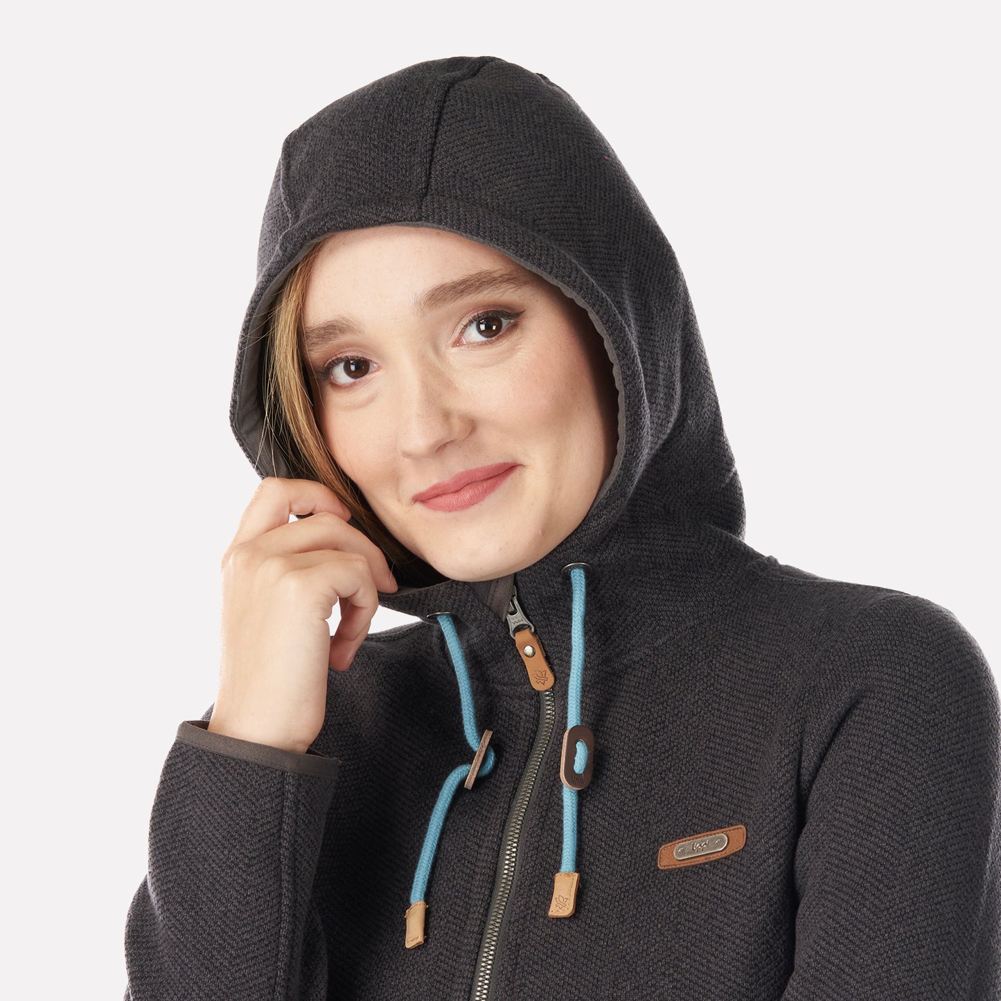 Chaqueta de fleece (textura jacquard) con gorro Cierre principal YKK Sistema de ajuste en gorro Bolsillos de mano Banda elástica en puño y basta Accesorios de cuero