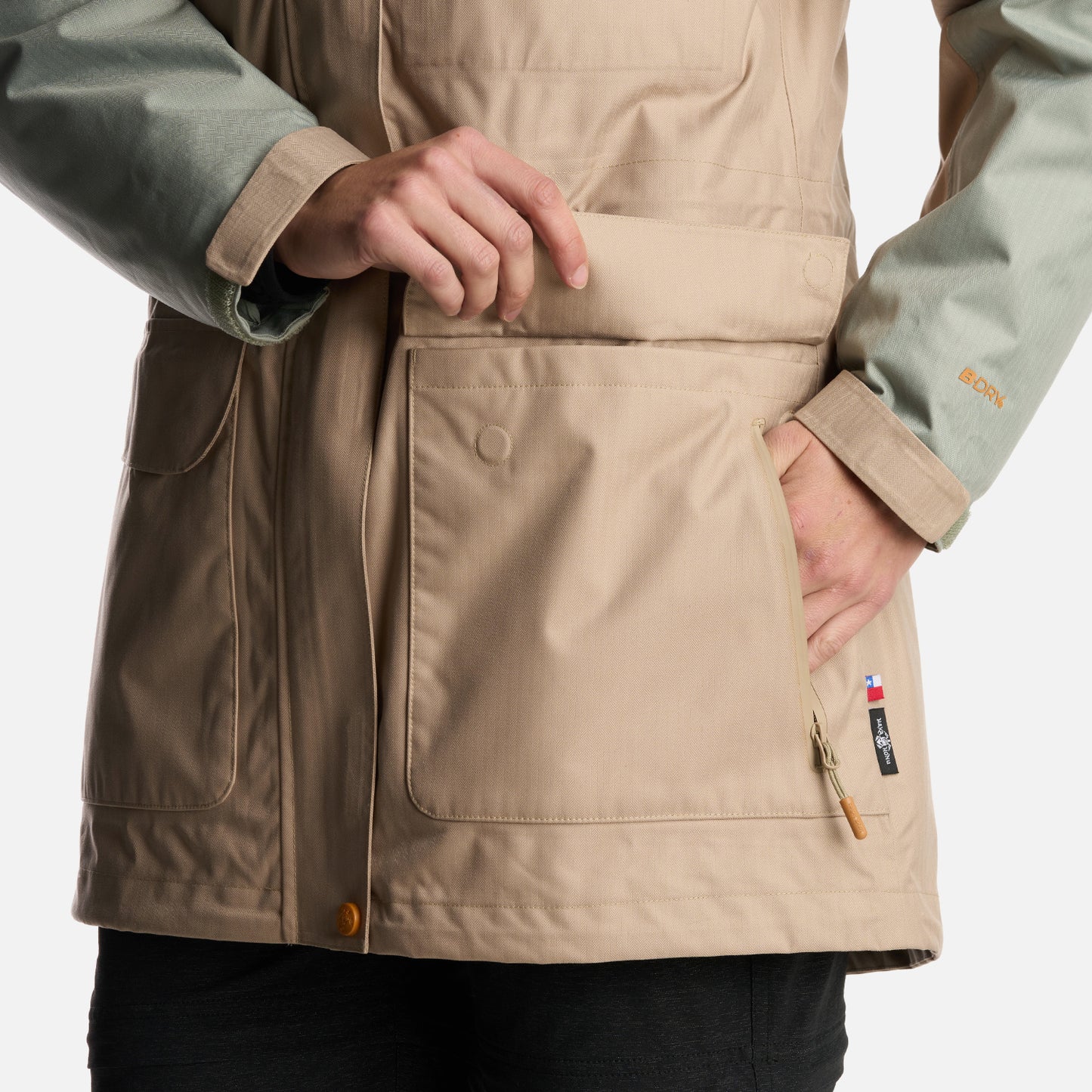 - Chaqueta 3 en uno de exterior impermeable. - Tratamiento antipilling. - Producto Sustentable. - Membrana 10.000 / 10.000. Relleno SteamPro 100% Poliéster reciclado con fibras de plástico reciclado del océano. - Cierre principal YKK. - Bolsillo de pecho con cierre YKK. - Gorro con sistema de ajuste de tankas delanteras, Gorro con ajuste trasero. - Ajuste en basta con tankas. - Ajuste en puños con tapeta y velcro, Puño con elástico interior. - Gráficas: Logos estampados. - Bolsillo interior. - Tapeta con broches a la vista. - Bolsillos con cierre SBS. - Calce regular.