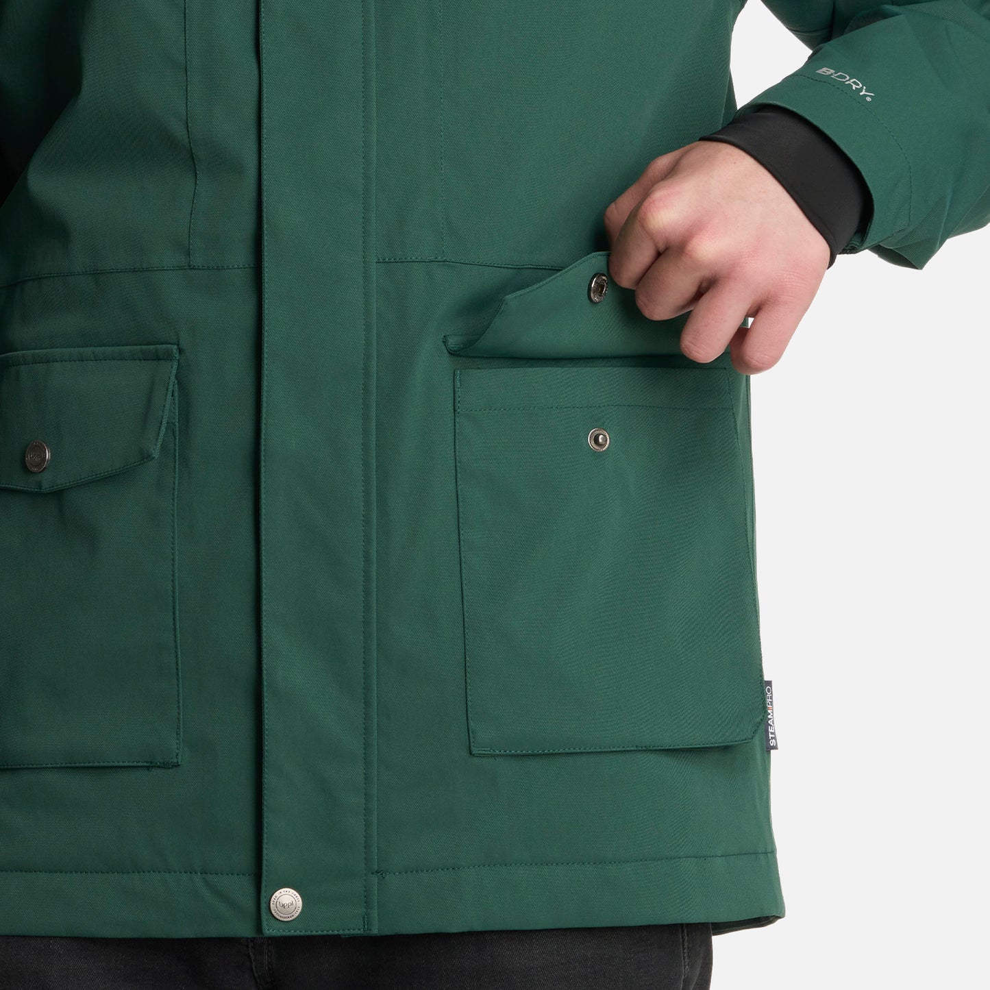 Chaqueta impermeable repelente con tecnología B-Dry® Membrana 10.000/10.000 Tela 100% polyester reciclado Cierre principal YKK y broches Interior insulado con relleno sintético steam-pro 100% reciclado Bolsillos de mano con tapeta y broche Bolsillos en pecho Ajustes en gorro con cordón Ajuste en puños con broches Piel sintética desmontable en el gorro Bolsillos internos