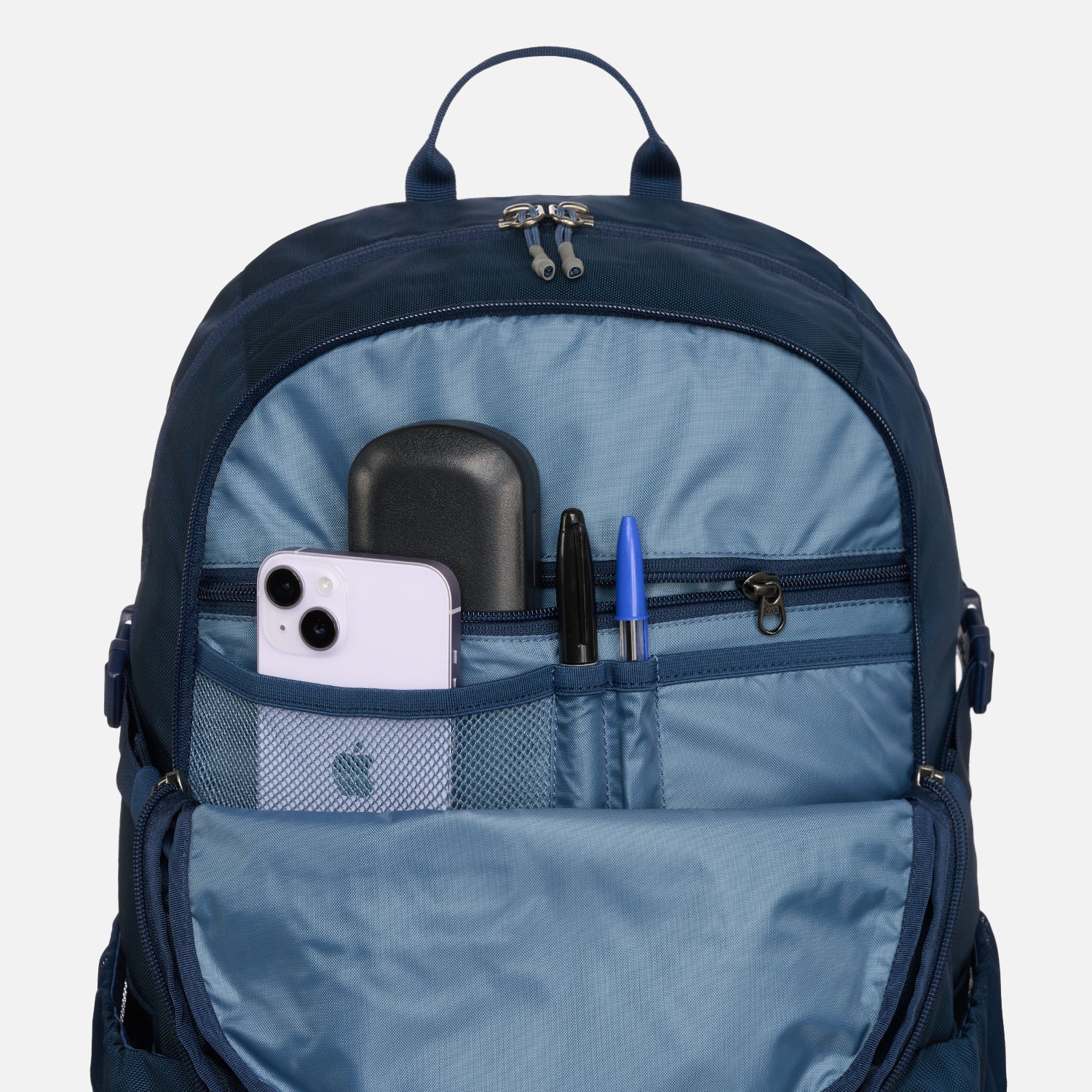 Exterior Polyester 840D (45% recycled) Interior Polyester 200D (45% recycled) Correas: Nylon. Broches: Duraflex®. Cierres: YKK®.