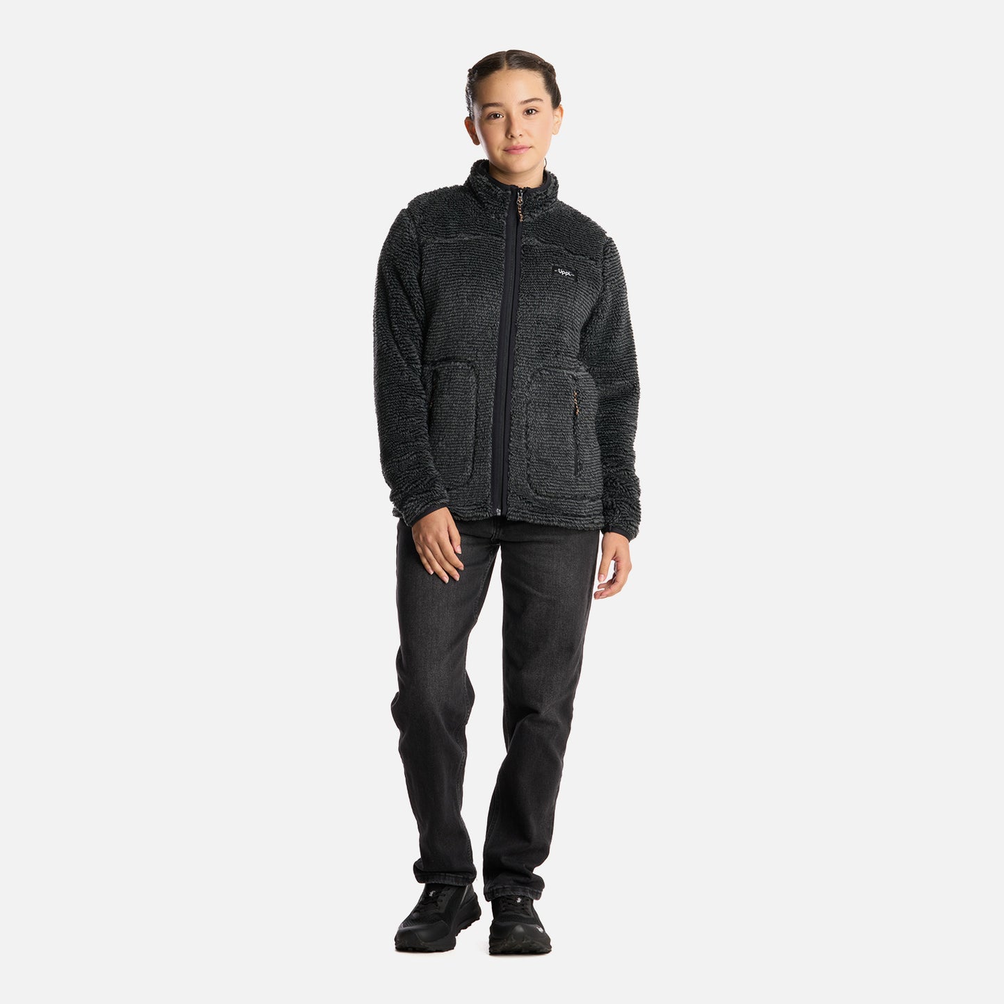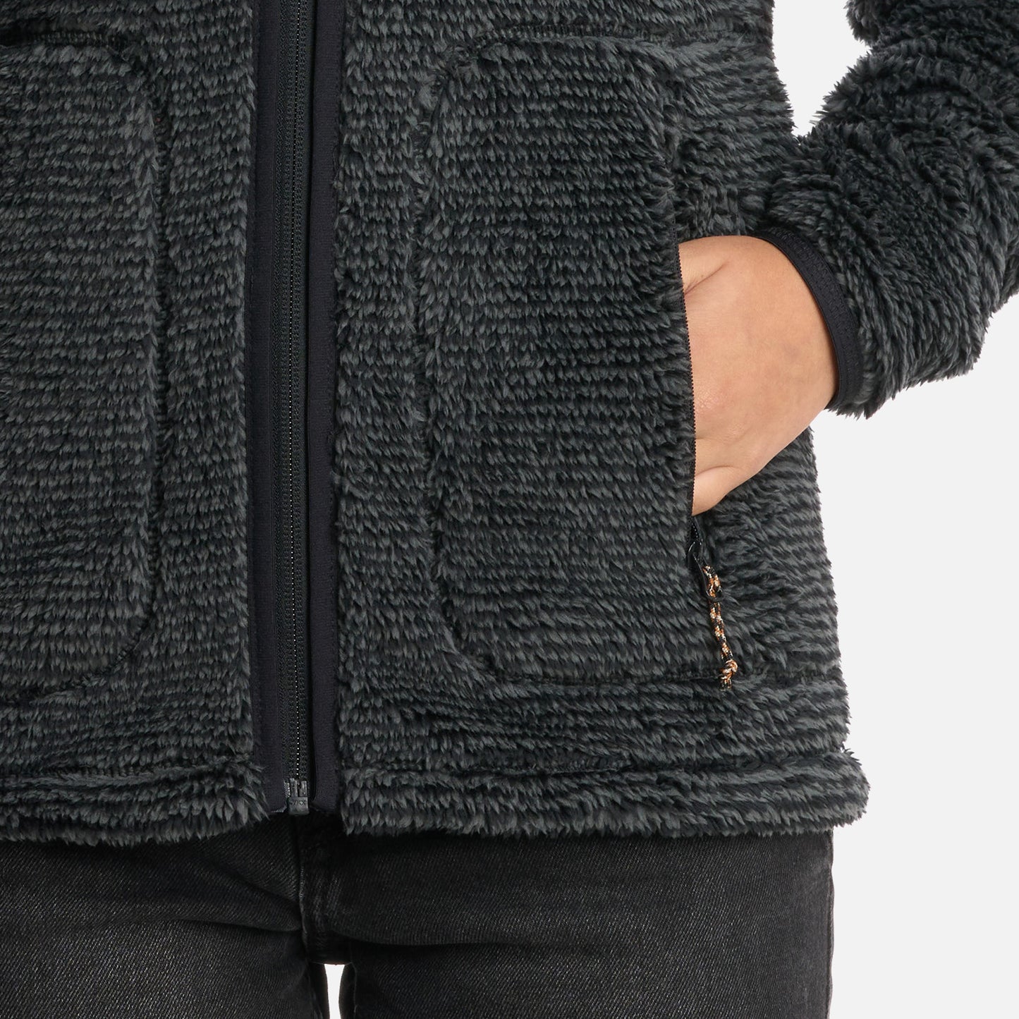 - Polerón shaggy de pelo largo. - Cierre principal YKK. - Bolsillos con cierre. - Calce regular