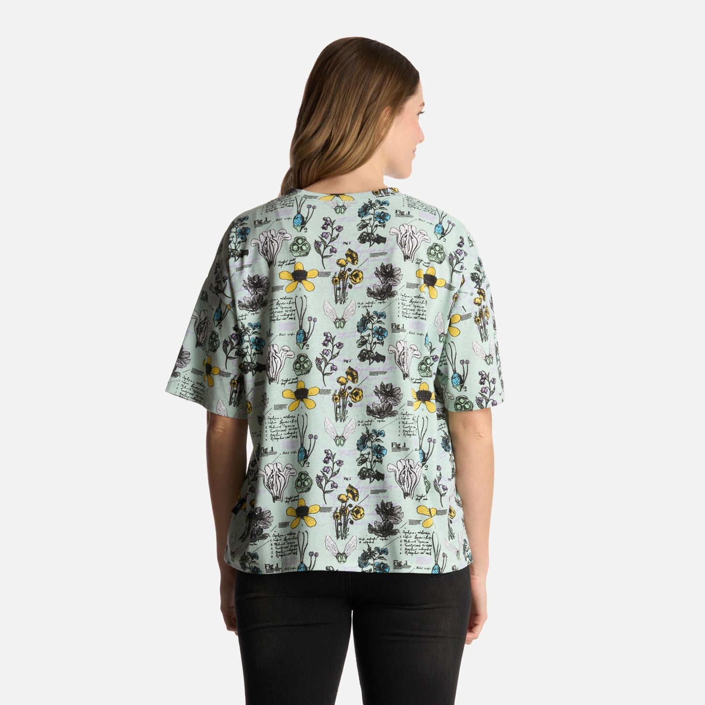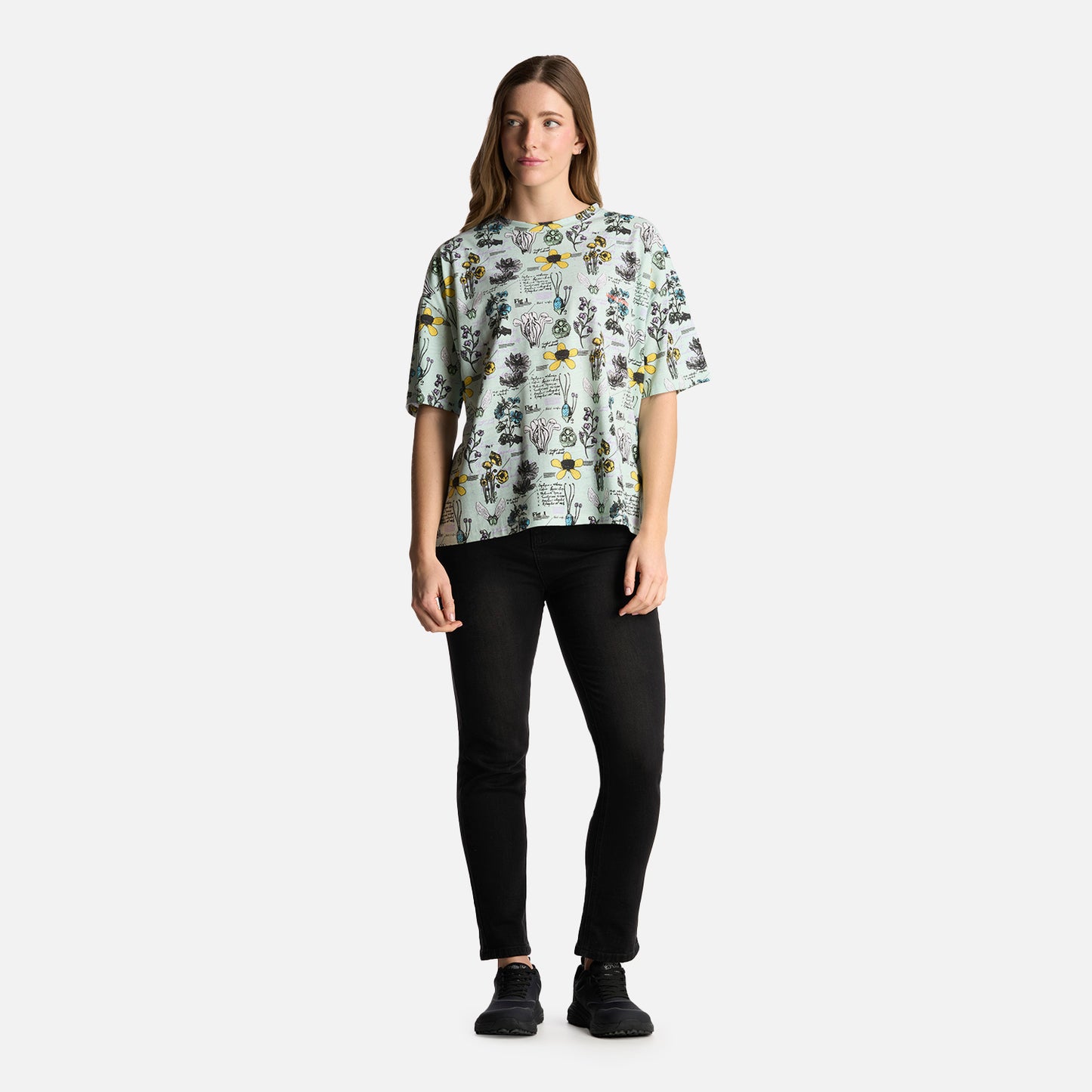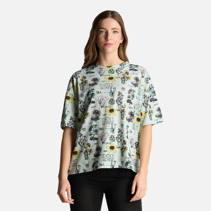 Hablemos de estampados lindos. La Botánica es un viaje hacia el sur verdecito, sus flores y colores. Una oda a la naturaleza ilustrada por el artista Moto Roker. Una polera de algodón, infaltable en los looks de verano, liviana y fresquita. Ojo que su calce es holgado. Arte hecho polera.